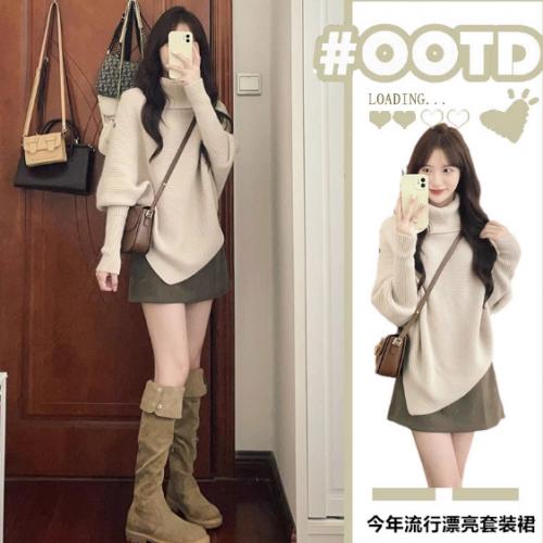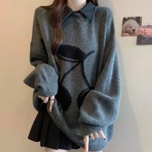 polo领假两件洋气针织毛衣女秋冬胖妹妹宽松遮屁股中