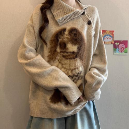 高级感斜领小狗提花毛衣套头外套秋冬