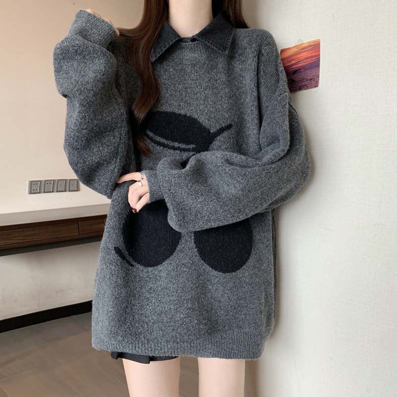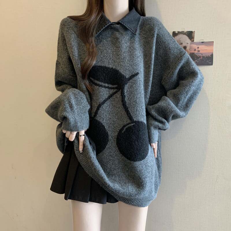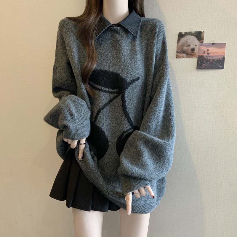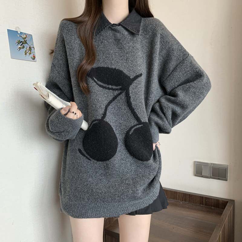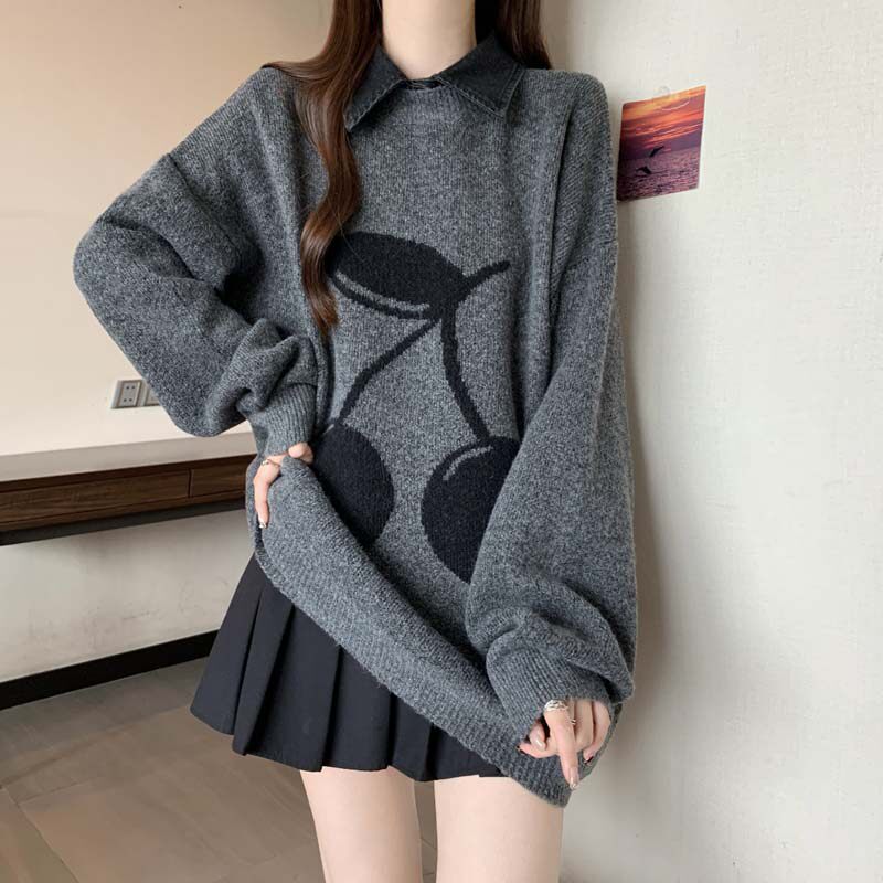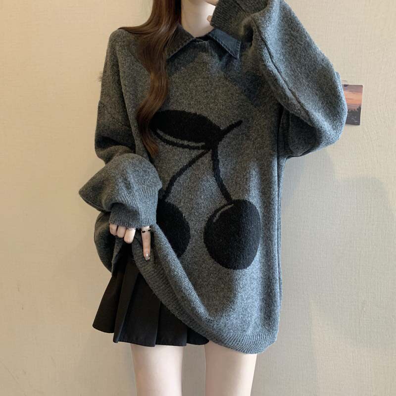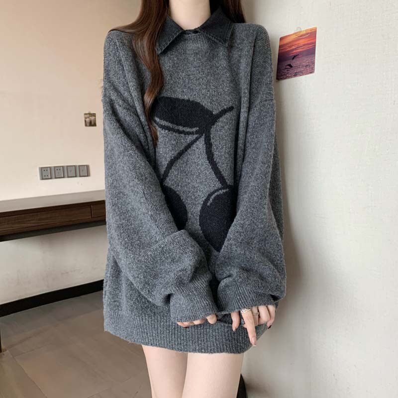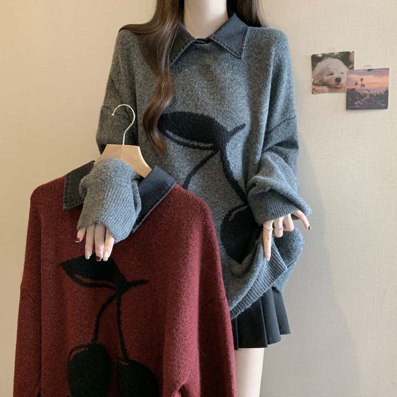 polo领假两件洋气针织毛衣女秋冬胖妹妹宽松遮屁股中长款上衣